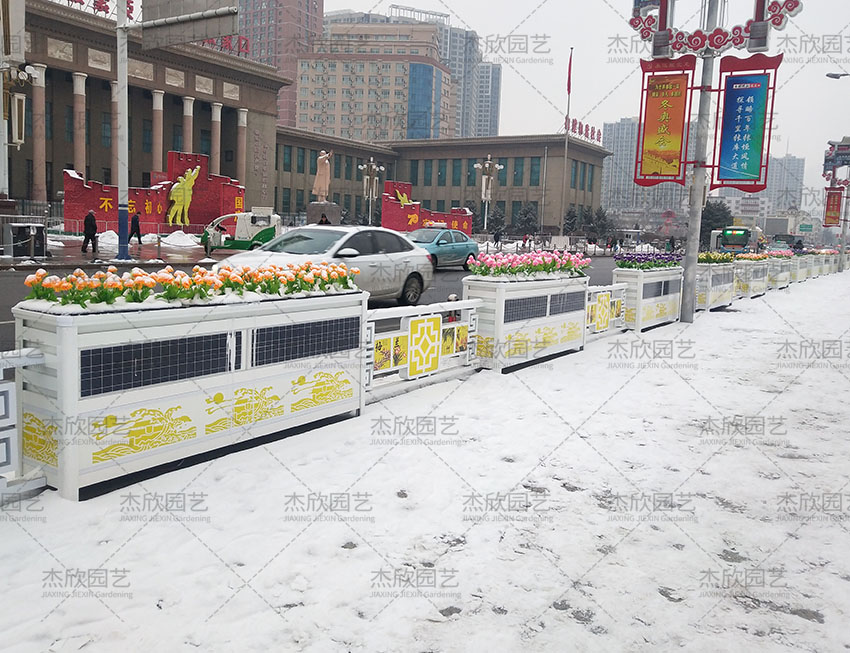 這款智慧花箱,外型設(shè)計(jì)由花箱、護(hù)欄組合,雅典白金色調(diào),增添古典氣息,發(fā)光圖案取自“春江花月夜”,充滿詩情畫意,增強(qiáng)了城市風(fēng)景的大氣感。