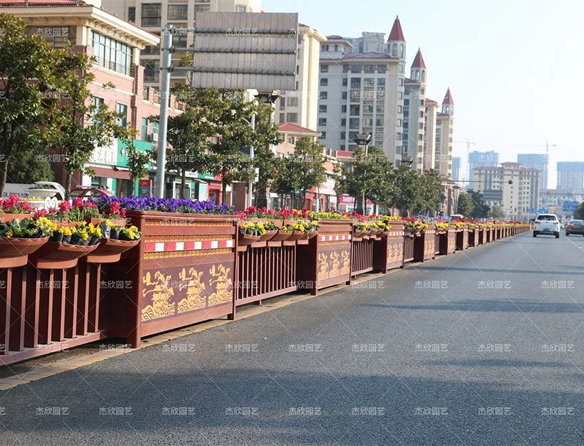 城市道路上的花箱組合的款式很多。看似復(fù)雜,但劃分開來可以分為花箱和花箱的組合,花箱和護(hù)欄的組合。這兩種花箱組合就是目前市政使用主要的兩種樣式。