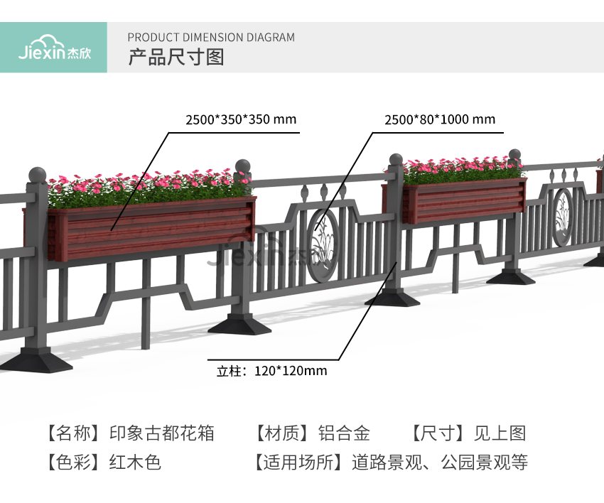 • 尺寸:花箱:250*35*35 護欄:250*8*100 立柱:12(長)*12(寬)(單位cm)