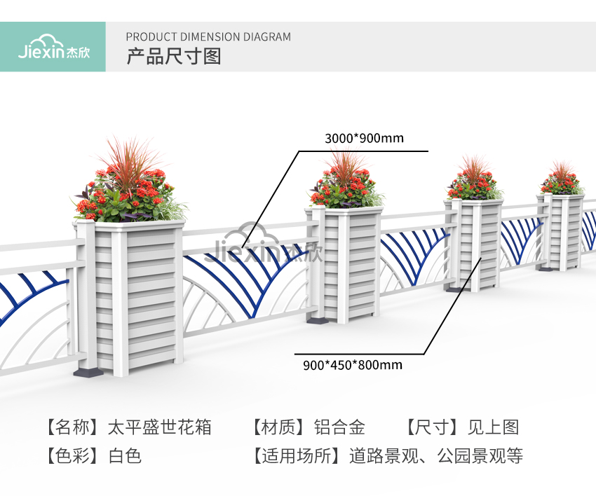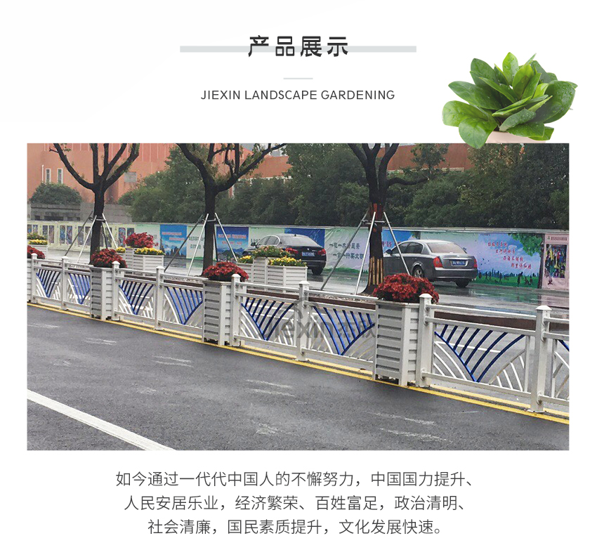 產(chǎn)品摘要: 經(jīng)典款的花箱護(hù)欄,白色花箱和鋅鋼護(hù)欄結(jié)合。白色花箱護(hù)欄具有提亮街景效果,而且美觀大氣。護(hù)欄部分開闊寬敞,不影響行車視線。白色花箱護(hù)欄與各類草花搭配,也能彰顯街道整潔美觀的效果。