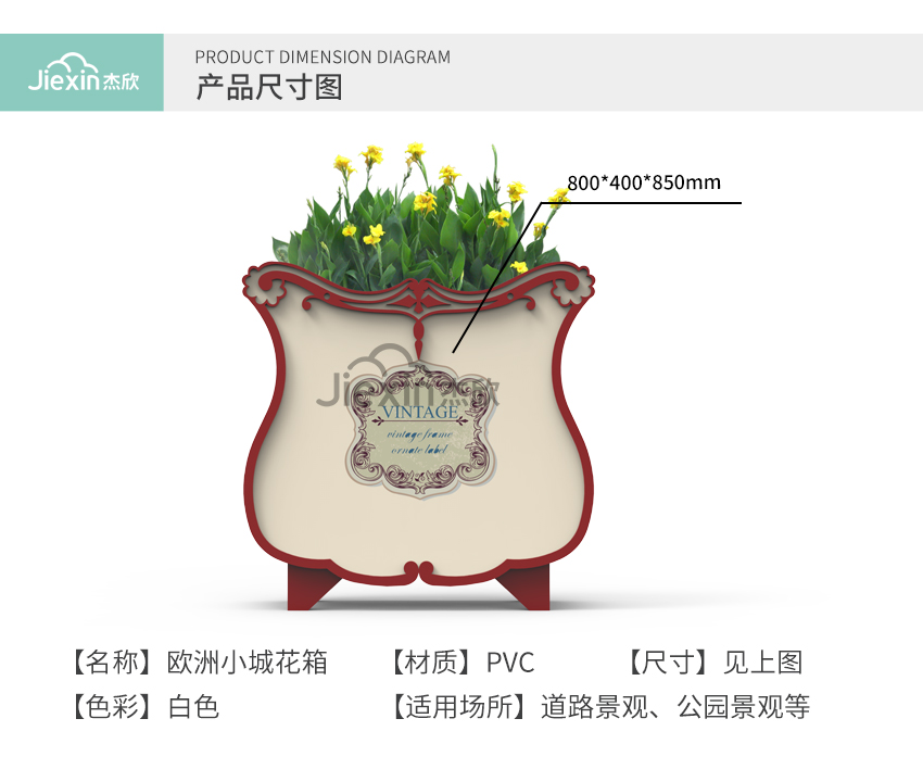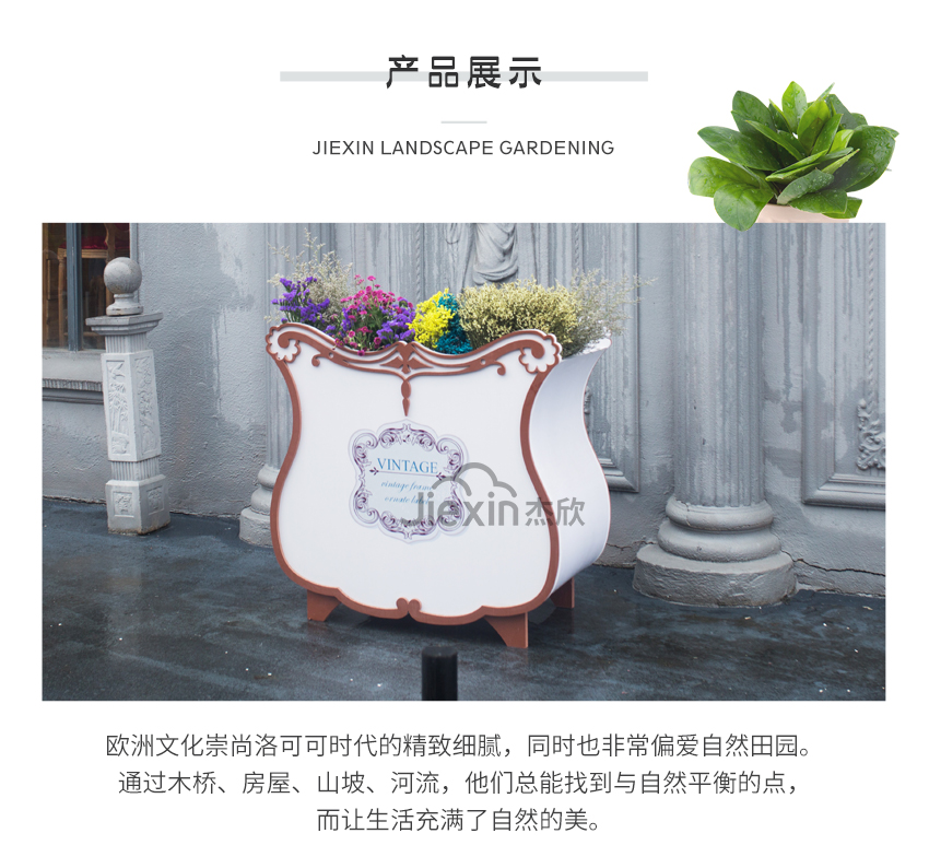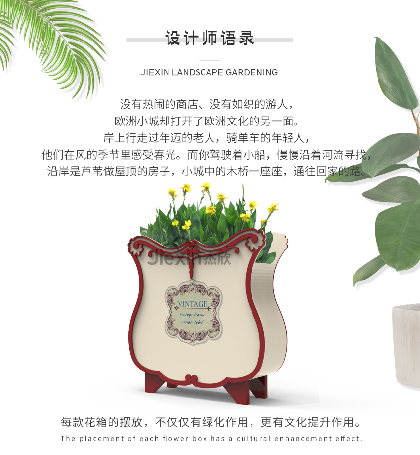 產(chǎn)品摘要: 獨(dú)特的外觀設(shè)計(jì)讓它在花箱中脫穎而出。偏歐式的花箱設(shè)計(jì),使用在現(xiàn)代街道上并不違和。而具有別樣的風(fēng)情花箱,非常適合城市特色街道使用。田園氣息的裝飾紋樣,也與城市風(fēng)景融合,不突兀。