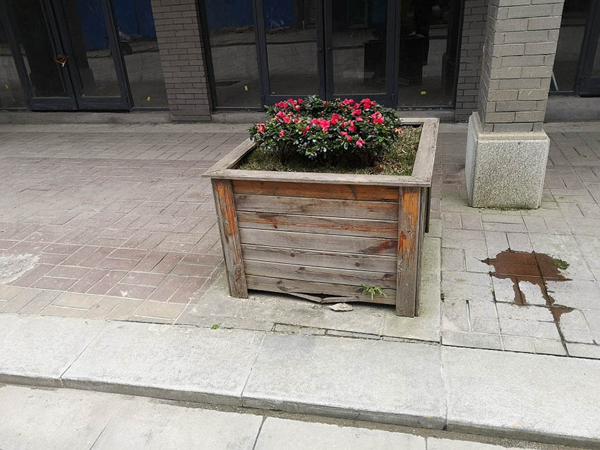 花箱的外觀已經(jīng)脫落,紅色的漆面零零星星。過去的道路非常喜歡用防腐木花箱,其實也因為只有防腐木花箱。
