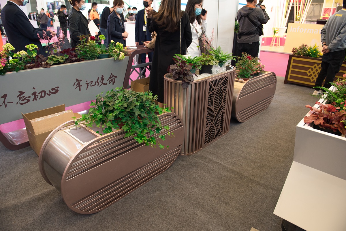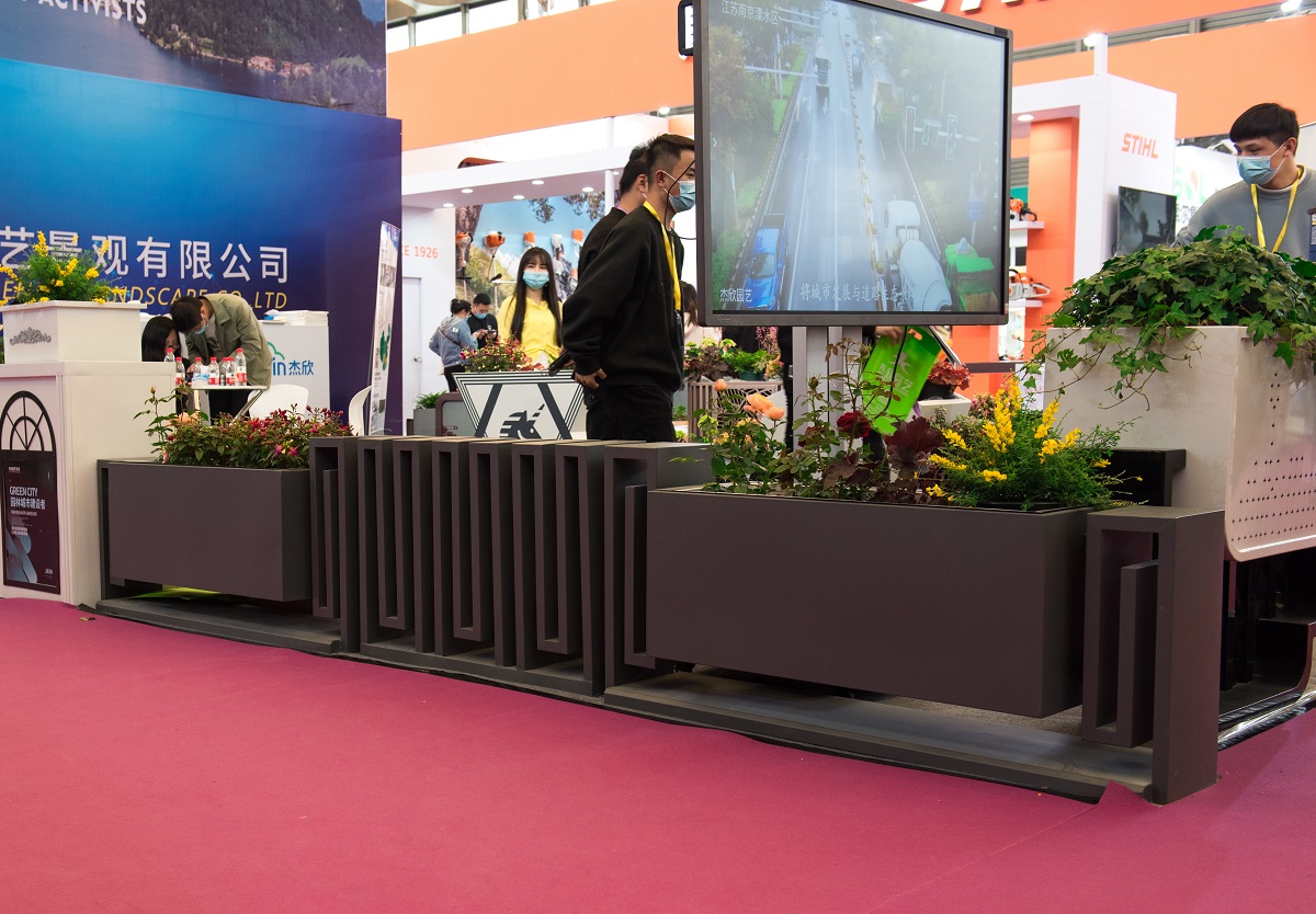 W5館展位中,杰欣園藝的鈑金花箱以靚麗的外觀、多彩的造型、領(lǐng)先的設(shè)計(jì)理念,分外引人注目。不少人駐足欣賞、拍照,咨詢了解花箱使用場(chǎng)景、材質(zhì)和性能特點(diǎn)。