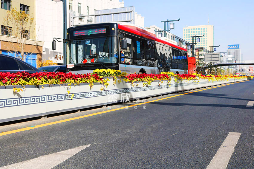 對(duì)中山路全路段進(jìn)行雙邊護(hù)欄的提升改造,共完成安裝護(hù)欄和花箱長2000多米,落地式組合花箱388米,在全線布置一體式花箱400多個(gè)。