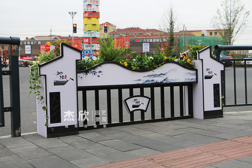 泗涇古鎮(zhèn)也保留了江南傳統(tǒng)文化的韻味,在道路花箱的選擇上,用水墨展現(xiàn)原生態(tài)的江南風(fēng)景。簡(jiǎn)化的馬頭墻、飛檐、窗格,都一一呈現(xiàn)出時(shí)代的美感。黑白看似單調(diào),但其中蘊(yùn)藏著無限的生機(jī),從無到有,從簡(jiǎn)單到豐富,都在意境中得到滿足。