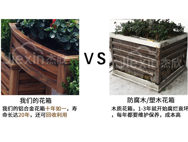 鋁合金花箱使用壽命在20年以上,顏色多樣,木紋鋁合金花箱采用德國進口木紋熱轉(zhuǎn)印技術(shù),木紋逼真,不褪色,強度高,鋁合金花箱防撞性強;