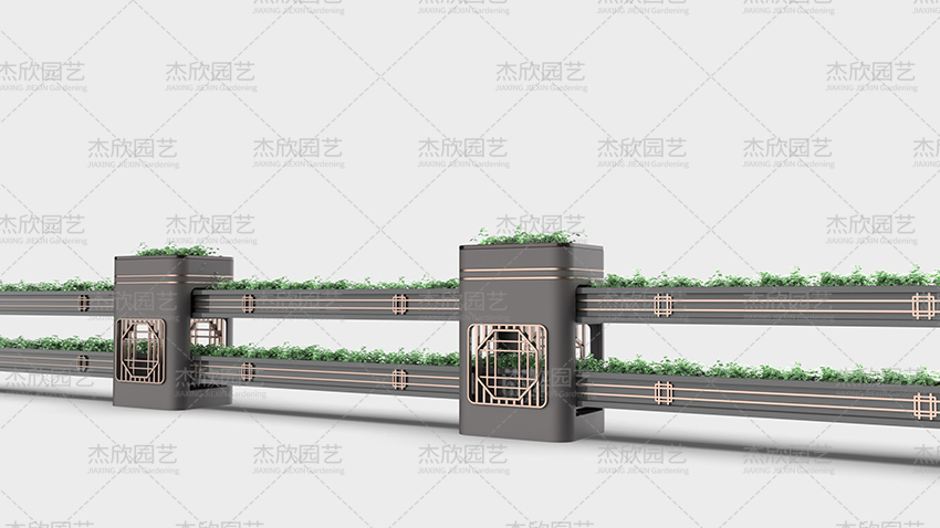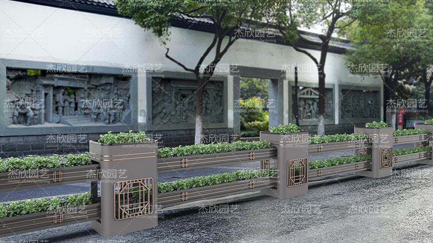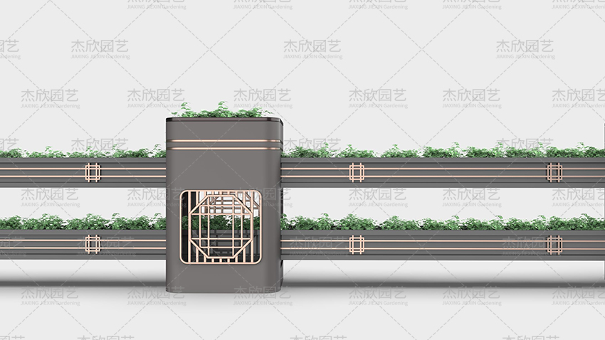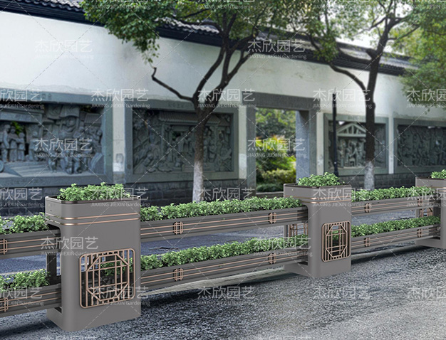 園林是中國建筑美的杰出代表,也是中國人對人居環(huán)境的詩意闡述。園林寄托著人們對美好生活的向往。園林藝術(shù)在當(dāng)代設(shè)計中也屢見不鮮,并深受喜愛。這組道路花箱將園林之中的窗格藝術(shù)之美融入其中,取其神,去其形,用現(xiàn)代手法表現(xiàn)出祥瑞之意。