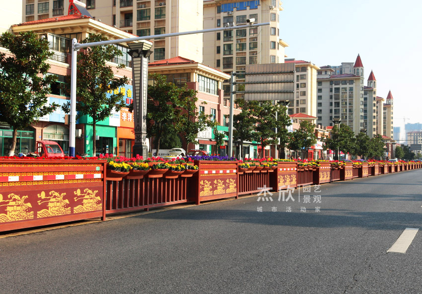 通過傳統(tǒng)朱紅、明黃配色,打造出富有傳統(tǒng)韻味的道路花箱。