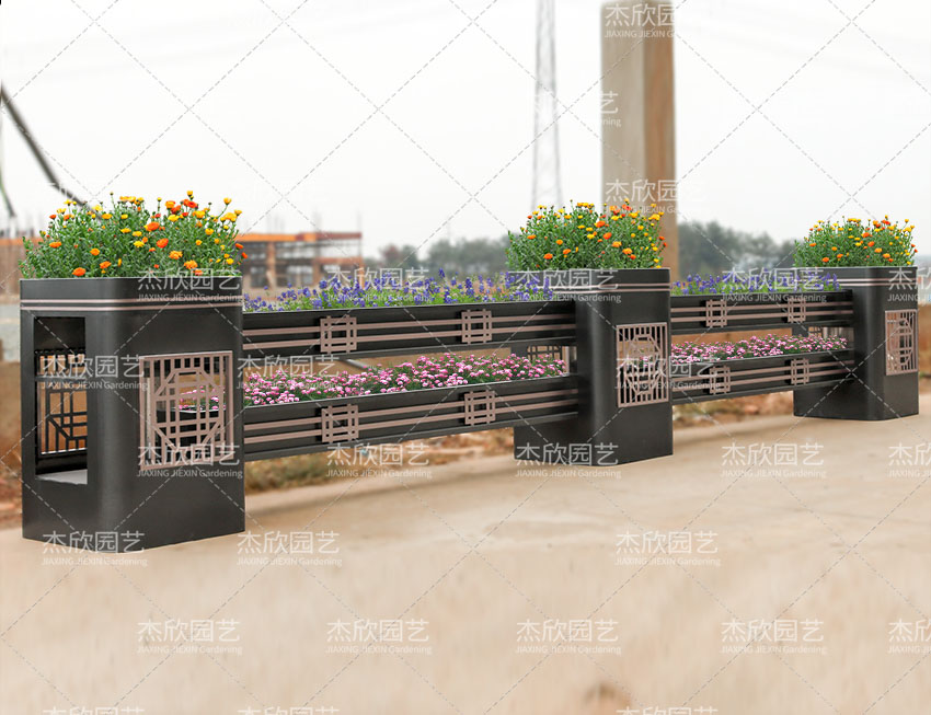 園林是中國建筑美的杰出代表,也是中國人對人居環(huán)境的詩意闡述。園林寄托著人們對美好生活的向往。園林藝術(shù)在當(dāng)代設(shè)計中也屢見不鮮,并深受喜愛。這組道路花箱將園林之中的窗格藝術(shù)之美融入其中,取其神,去其形,用現(xiàn)代手法表現(xiàn)出祥瑞之意。